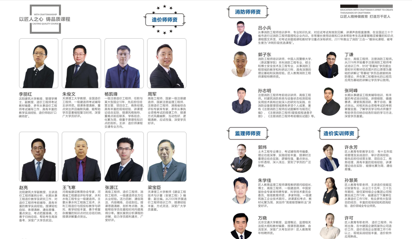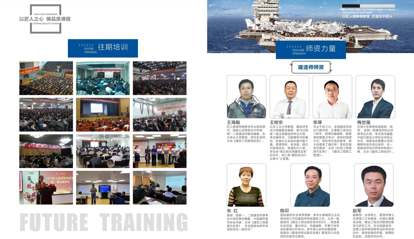 世纪匠人教育依托清华大学、北京建筑工程学院、北京交通大学、天津理工学院、天津大学、东北财经大学等高校强大的师资力量和建设部各专业资格考试教材编委鼎力支持,采用老师面授教学,授课教师大多是考试大纲编委、教材编委及主编老师,有着丰富的考试辅导经验,能使学员朋友在短的时间内,迅速掌握考试重点和方法,轻松通过考试。
