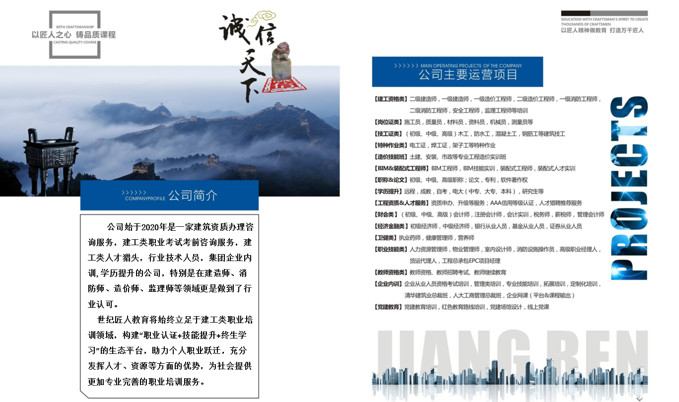 “成都世纪匠人教育该公司是一家专业从事工程建设领域人员执业资格考前培训咨询,建筑企业人才服务,工程资质咨询的专业公司!