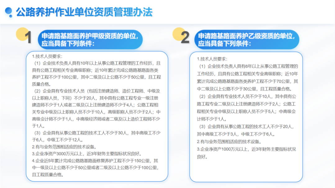 自2022年起,由于公路养护资质的管理开始实施以来,各省市逐步完善企业资质的审核,也就是说:今后没有资质的企业将无法参与公路养护项目的施工作业。